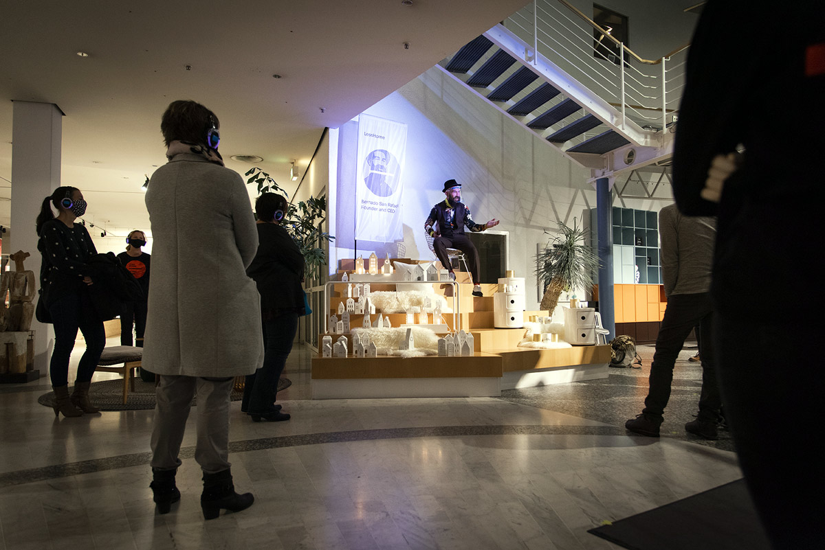 Heute lädt das Heimatministerium zur großen Auftaktveranstaltung von LessHome ein illustres Fachpublikum ins Möbelhaus ein. Sie alle schauen zu, wie sich die Bewerber mit ihren wenigen Habseligkeiten im Showroom häuslich eingerichtet haben – wie sie erzwungenmaßen flexibel das neue Zeit- und Raummodell leben. Dabei sind Disziplin, Erfindungsreichtum und Opferbereitschaft nur einige der Tugenden, die LessHome erfordert. Ein Casting vor Publikum, ein verstörendes Bedürfnisstriptease als Ausweg aus der Wohnungsnot – den potentiellen Vermietern.